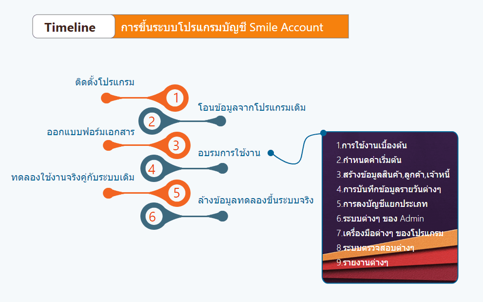 - เมื่ออบรมครบทุกฝ่ายแล้ว ก็กำหนดนัดหมายการขึ้นระบบจริงหรือใช้งานคู่ขนานกับโปรแกรมเดิม